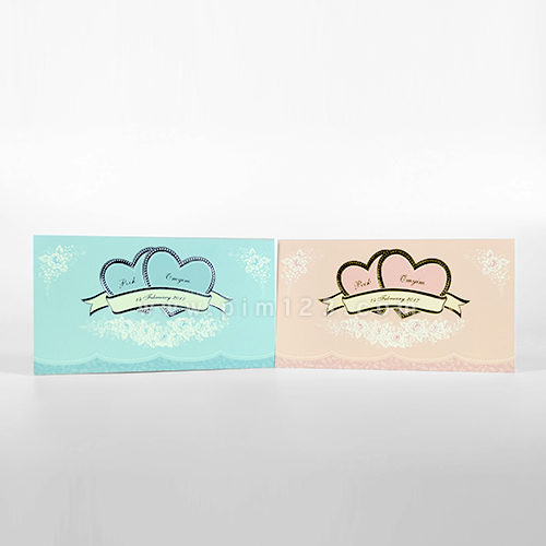 การ์ดแต่งงานสุดน่ารัก เอาใจคนชอบสีพาสเทล เพิ่มความน่ารักด้วยลายหัวใจคู่บนการ์ด และเทคนิคการพิมพ์อย่างดี ราคาเป็นมิตร